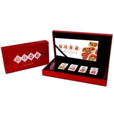 《福禄寿喜》彩色邮票银砖发行:北京市邮票公司监制发行.发行背景:4月27日,中国邮政发行《福禄寿喜》特种邮票1套4枚,分别为(4-1)T“福”、(4-2)T“禄”、(4-3)T“寿”、(4-4)T“喜”,面值均为1.2元。该套邮票由我国著名邮票设计师王虎鸣设计,以喜庆吉祥的图案和卓越的艺术理念广受收藏爱好者欢迎,《福禄寿喜》邮票金银砖配套发行。2g纯金+20g纯银四枚套装Au999,2g+Ag999,10g四枚套装10000《福禄寿喜》邮票银砖是以《福禄寿喜》特种邮票为正面图案,主体为“福”、“禄”、“寿”、“喜”四个书法汉字,并配以传统吉祥纹样,邮票图案中的神话故事、历史传说、珍禽异兽、祥花瑞草、吉祥器物等吉祥元素充分呈现金属质感,不仅完全展现了邮票中的“福”“禄”“寿”“喜”图案,更因其特殊的白银材质,同时具有“福禄寿喜财”五福具臻的吉庆色彩,体现了和谐盛世的喜庆特点和人们追求幸福生活、祈望吉利平安的吉祥寓意。