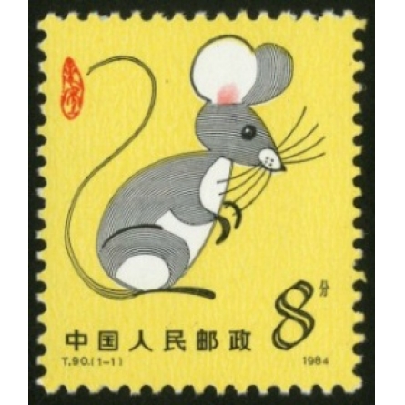 1984年1月5日,我国邮电部准时特发行“甲子年”生肖邮票,图案采用的是我国著名漫画家詹同创作的一只有趣、可爱的老鼠。这只老鼠嘴上八根胡须清晰可数,一双大大的招风耳,细长的尾巴指高气昂的向上翘着,小眼睛炯炯有神又那么贪婪的瞪得溜圆,显得机灵、诙谐。经过漫画手法的处理,这只老鼠不再是人人喊打的可憎之物,而是两腿站立,一双弯弯的小爪在胸前微微拱起,神情幽默,仿佛在向人们祝贺新年,乍现新春喜庆的妙趣。