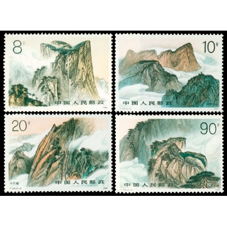 名山五岳系列邮票—华山由邮电部于1989年8月25日发行,共计四枚,每套总面值1.28元,影雕套印。这四枚邮票分别是:西岳五峰(面值8分,发行量2370.95万枚),华山远眺(面值10分,发行量2071.75万枚),千尺幢(面值20分,发行量2111.7万枚),苍龙岭(面值90分,发行量2150.7万枚)。