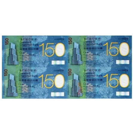 为庆祝在港成立150周年,香港渣打银行首次发行面值为150元的整版纪念钞,属全球首度有此面值的国际货币。作为香港历史最悠久的发钞银行,渣打香港希望通过发行此次慈善纪念钞票向一直与之并肩向前的香港市民表示谢意,并回馈社会,所有净收益将拨捐渣打香港150周年慈善基金。香港渣打纪念钞是继07年7月金融管理局发行10元胶钞和08年中银发20元奥运纪念钞后,香港再有新款钞票。
