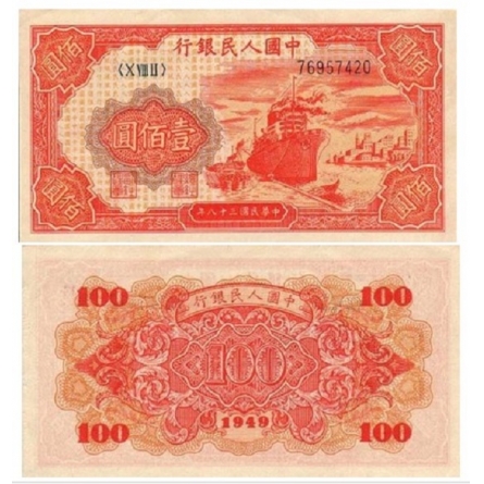 【藏品名称】第一套人民币壹佰圆红轮船(号码八位数)100元