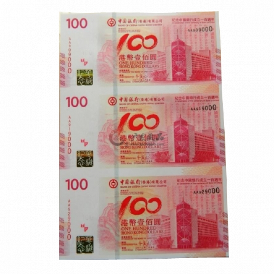 中国银行100周年纪念钞三连体(香港),纪念钞面值为港币300元,寓意吉祥、喜庆和激情的红色为主色调。钞票正面以缠绵不断的万里长城和宏伟的北京中国银行大厦为主景,展现历史悠久的中国银行稳健卓越、实力雄厚。钞票背面主景为香港的国际金融中心风貌和著名的地表中银大厦。展现中国银行的国际化形象,以及为香港的长期繁荣稳定作出贡献,纪念钞图案简洁,色调柔和,雕工细致,极具珍藏价值。