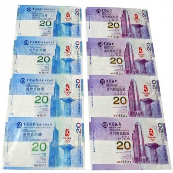 香港20元奥运纪念钞: 中国银行香港有限公司于7月11日发行港币20圆面额的北京2008年奥运会港币纪念钞以迎接和纪念北京奥运会。经国际奥委会和北京奥组委批准,并根据澳门特别行政区第5/2008号行政法规,中国银行澳门分行获准发行第29届奥林匹克运动会澳门币纪念钞,面值贰拾元。