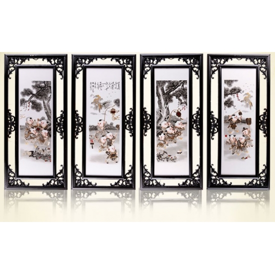 【品名】有框瓷板画四屏条婴戏图