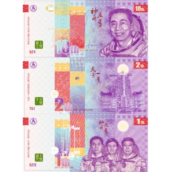 中国航天测试钞三联体记录了神舟征服太空的重大历史事件。将中国的航天事业以纸币的形式完美的展现出来。全国发行量仅为5万张。但只有极少数流入市场,因此,收藏的价值极大。