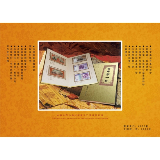 《百年第一钞》纸币珍藏册收录了中国银行在百年历史中所发行的珍贵纸钞,讲述着从昔日战火纷飞到今日辉煌盛世的风雨历程。其意义深远、极其珍贵,是千载难逢的收藏珍品。为保证该藏品的权威性、真实性,中国国际收藏家协会对《百年第一钞》的编纂进行全程监制,有关领导和专家对其内容进行审订和修改,并严格按照审稿意见制作。本册收藏的外币均通过国家外汇管理局批准,可在世界各地流通使用。