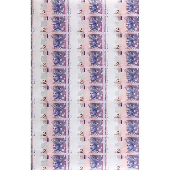 马来西亚RM2 30连体钞是马来西亚国家银行在1996年马来西亚发行的第一版连体整版钞,是为数不多的世界连体钞之一,马来西亚MALAYSIA RM2 30连体钞整体以紫色为主色调,正面图案是马来西亚的第一任最高元首东姑·阿卜杜勒·拉赫曼 (Tuanku Abdul Rahman 1895-1960),右上角和左侧都标有“2”的字样,左侧文字部分是英文书写的“马来西亚国家银行”。背面图案是马来西亚首都吉隆坡观光塔、人造卫星、马来西亚中央银行的徽标,左上角和右侧分别标有冠字和编码,右上角和中间都标有“2”的字样,中间有一道金属防伪线。