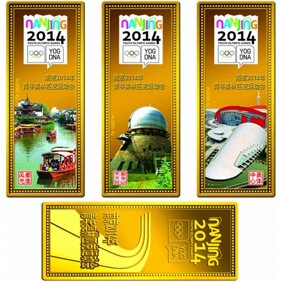【图案设计】三枚金条正面图案分别为南京2014年青年奥林匹克运动会的会徽、中文名称,以及南京三个景点(秦淮风光、紫金山天文台、奥体中心)和“秦淮风光”、“紫金山天文台”、“奥体中心”的印章;金条背面为金箔复合护层,图案统一为南京2014年青年奥林匹克运动会的会徽和中文名称。