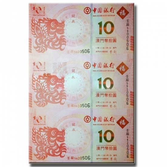 《辰龙生肖纪念钞》为庆祝中国农历新年,澳门特区将发行生肖纪念钞。大西洋银行(B.N.U.)及中国银行(B.O.C.)2012辰龙生肖纪念钞防伪技术高超,纸币两面的中间位置尚印有多层次水印......