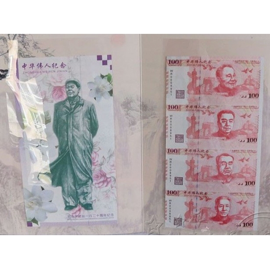 毛泽东香味测试钞(五大伟人测试钞)四连体,四连体单钞最大发行量10000枚,四连体同号对钞最大量仅为1000对,因其创造世界印钞史多个第一,具有很高的纪念价值和收藏价值。