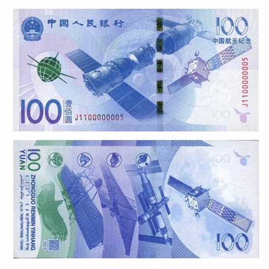 中国人民银行定于2015年11月26日发行中国航天纪念钞一张,中国航天普通纪念币一枚。中国航天纪念钞面额为100元,票面长为155毫米,票面宽为77毫米,发行数量为3亿张。与现行流通人民币职能相同,与同面额人民币等值流通。纪念币面额为10元,直径为27毫米,材质为双色铜合金,发行数量为1亿枚。与现行流通人民币职能相同,与同面额人民币等值流通。
