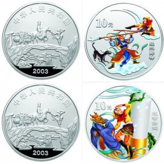 纪念币规格和发行量:2003年《西游记》1盎司彩色银币2枚为精制币,含纯银1盎司,规格40毫米,面值10元,成色99.9%,最大发行量为38000枚。