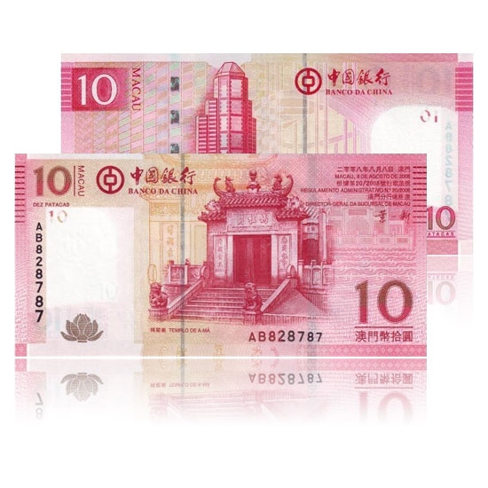 纪念澳门回归钞包括10元、20元两种面值,本藏品为10元面值,由中国银行权威发行,全新、全品相。钱币右上角有2008年8月 8日字样这个日期是它的首次申报日期,从申报到发行共有两年之久,由于种种种原因一直没有审批下来,直到09年二次申报才发行出来,异常珍贵,钱币的主景图案选自澳门世界文化遗产名录中的景点。10元正面是妈阁庙,20元正面是大三巴牌坊,背面选用澳门中银大厦作为主景,衬景是澳门的四座大桥,寓意澳门钱币在中西交流中占据桥梁作用。