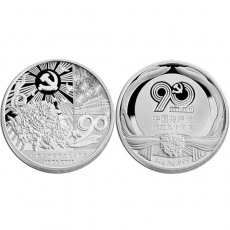 银章(直径40毫米)正面图案均为纪念建党90周年的标志性图案和喜庆配图,并刊材质、重量等要素;背面图案均为党徽与欢庆场景的组合图案,其中党徽、天安门与盛开的牡丹花寓意在中国共产党的领导下新中国从无到有,并创造了当今的繁荣与昌盛。